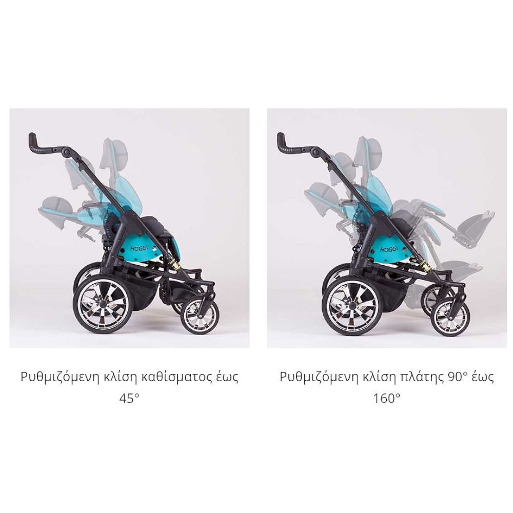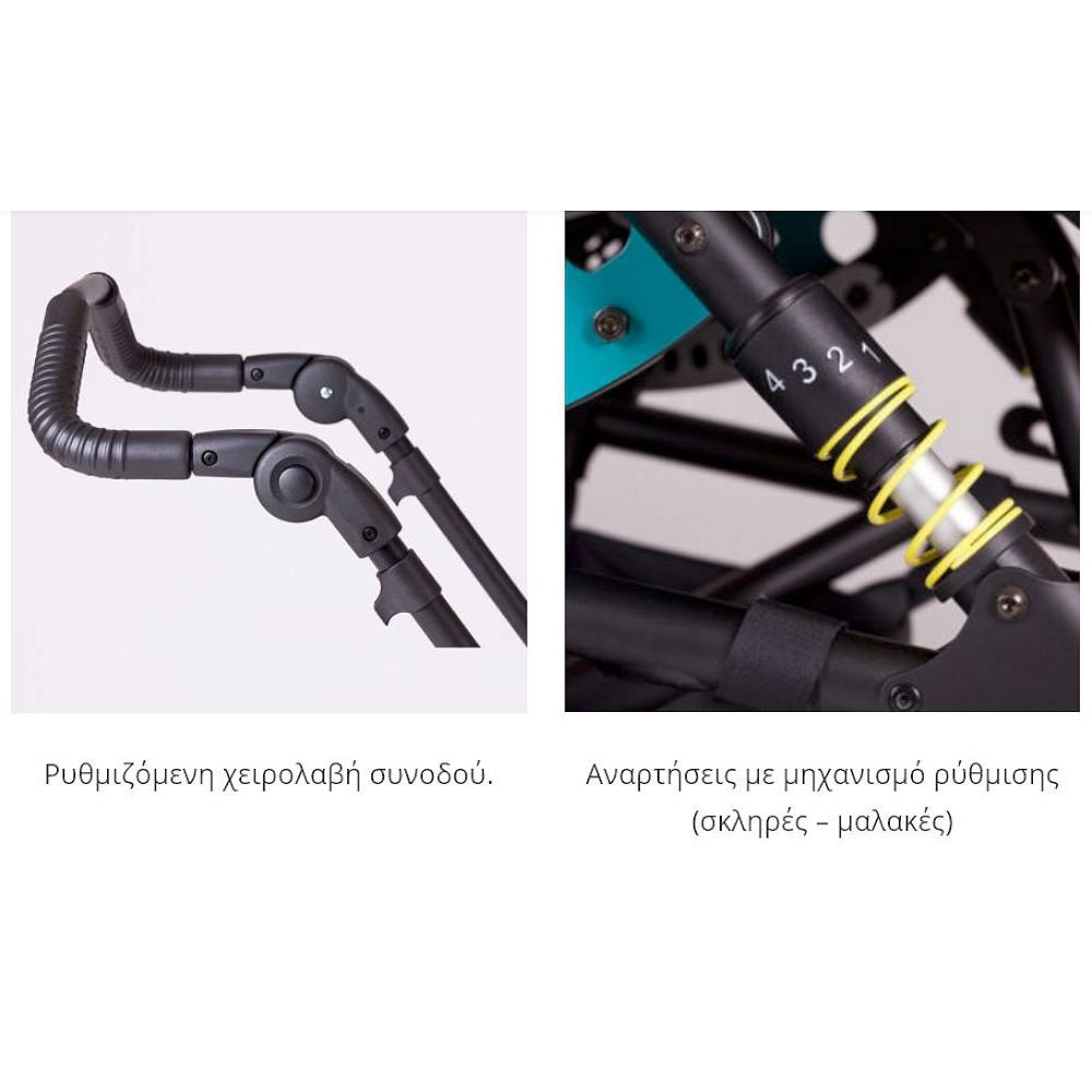Αποτελείτε από: 4τροχη βάση εξωτερικού χώρου, κάθισμα, προσκέφαλο και υποπόδιο.