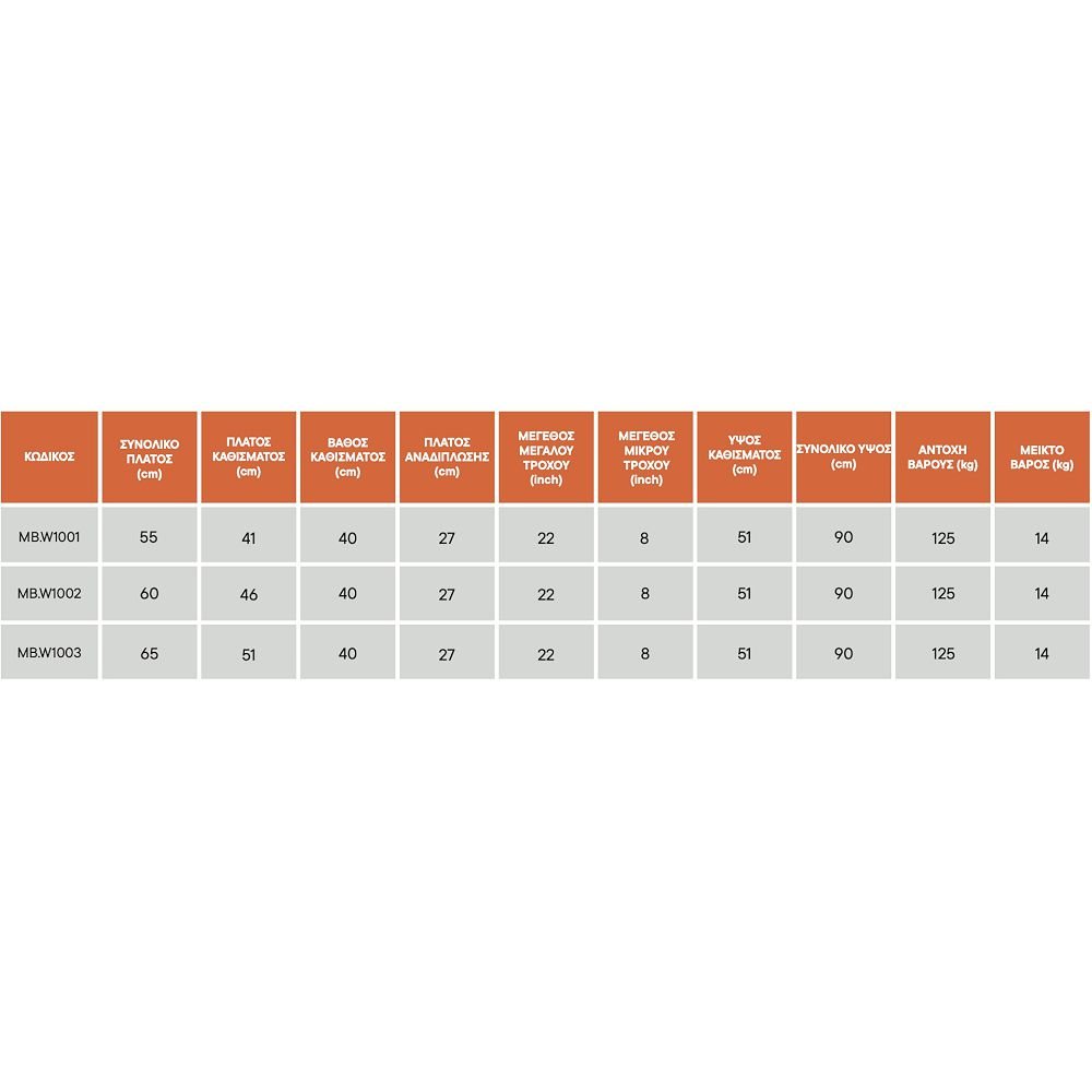 MB.W1001: Πλάτος (σε εκ.) καθίσματος 41, πλάτης 38, συνολικό 55