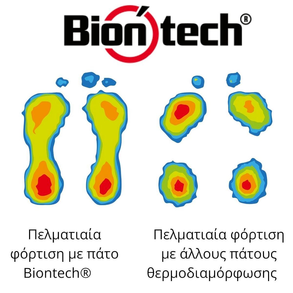 Οι πάτοι Biontech® σχεδιάστηκαν για να προσαρμόζονται τέλεια στο σχήμα του εκάστοτε ποδιού, προσφέροντας άνεση, σταθερότητα και εξαιρετική απορρόφηση κραδασμών σε κάθε βήμα! Με τη νέα τεχνολογία self-molding, οι πάτοι θερμαίνονται για 40’’ στα 500W σε φούρνο μικροκυμάτων ή σε κλασικό φούρνο στους 80 βαθμούς για 3 λεπτά και στη συνέχεια διαμορφώνονται ώστε να ακολουθήσουν την ανατομία του πέλματος σας (δείτε οδηγίες πιο κάτω). Με αυτόν τον τρόπο προσφέρουν σωστή στήριξη του πέλματος καθώς και ομοιόμορφη κατανομή των πιέσεων και των φορτίων. Ανακουφίζουν από μυϊκούς πόνους καθώς και πόνους των αρθρώσεων στη μέση, γόνατα και στην ποδοκνημική. Η αναπνεύσιμη μικροΐνα και η αντιβακτηριακή επεξεργασία κρατούν το πόδι στεγνό και υγιές όλη μέρα, ενώ η ενισχυμένη σταθερότητα (έως 44%) κάνει τους Biontech ιδανικούς για έντονη ή πολύωρη χρήση.