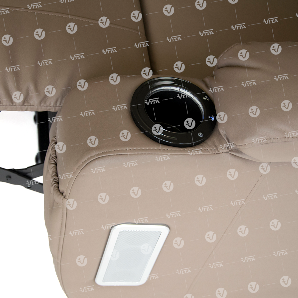 Διαθέτει θέση ποτηριού με ψύκτη και led φωτισμό. Φέρει θύρα bluetooth, βάση στήριξης tablet ή κινητού τηλεφώνου και δύο ηχεία παράπλευρα στο κάθισμα.