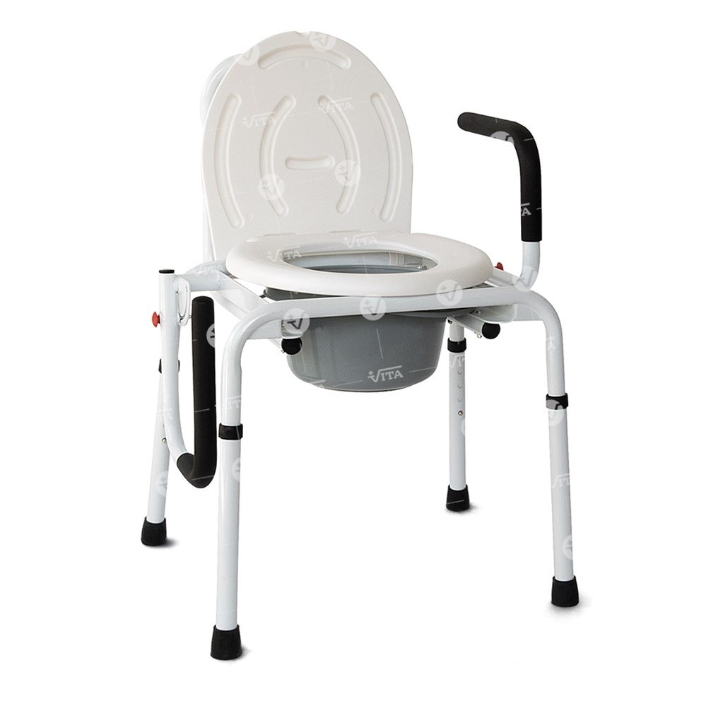 Καρέκλα τουαλέτα µε πτυσσόµενα πλαϊνά. Mεταλλική κατασκευή ηλεκτροστατικής βαφής. Μαλακή επένδυση στις χειρολαβές του καθίσµατος. Χρησιµοποιείται ως ανυψωτικό τουαλέτας χωρίς το πλαστικό δοχείο, ως καρέκλα µπάνιου και ως κάθισµα µε δοχείο – wc – το οποίο αφαιρείται εύκολα και πλένεται.
