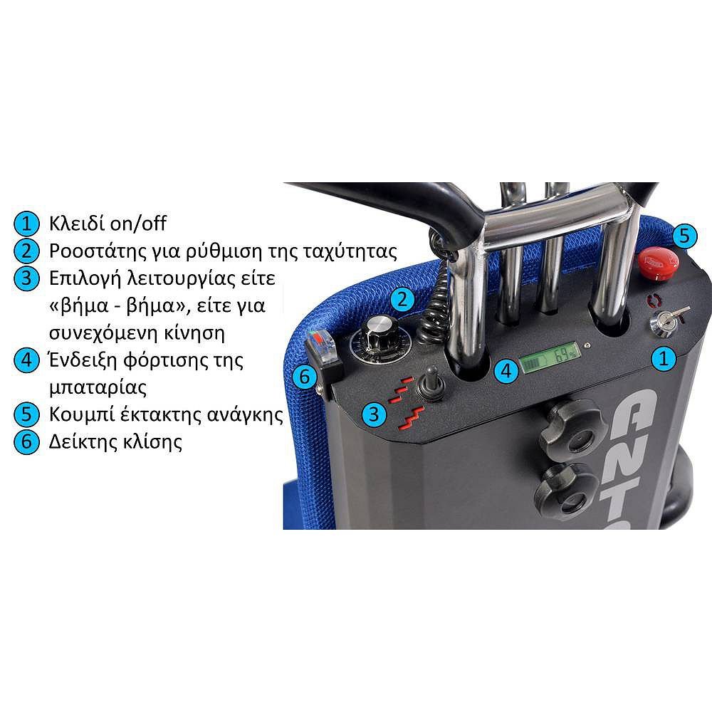- Εργονομικά σχεδιασμένες λαβές με μεγάλα κουμπιά και βραχίονες ρυθμιζομένου ύψους (33cm), για εύκολο και ασφαλή χειρισμό