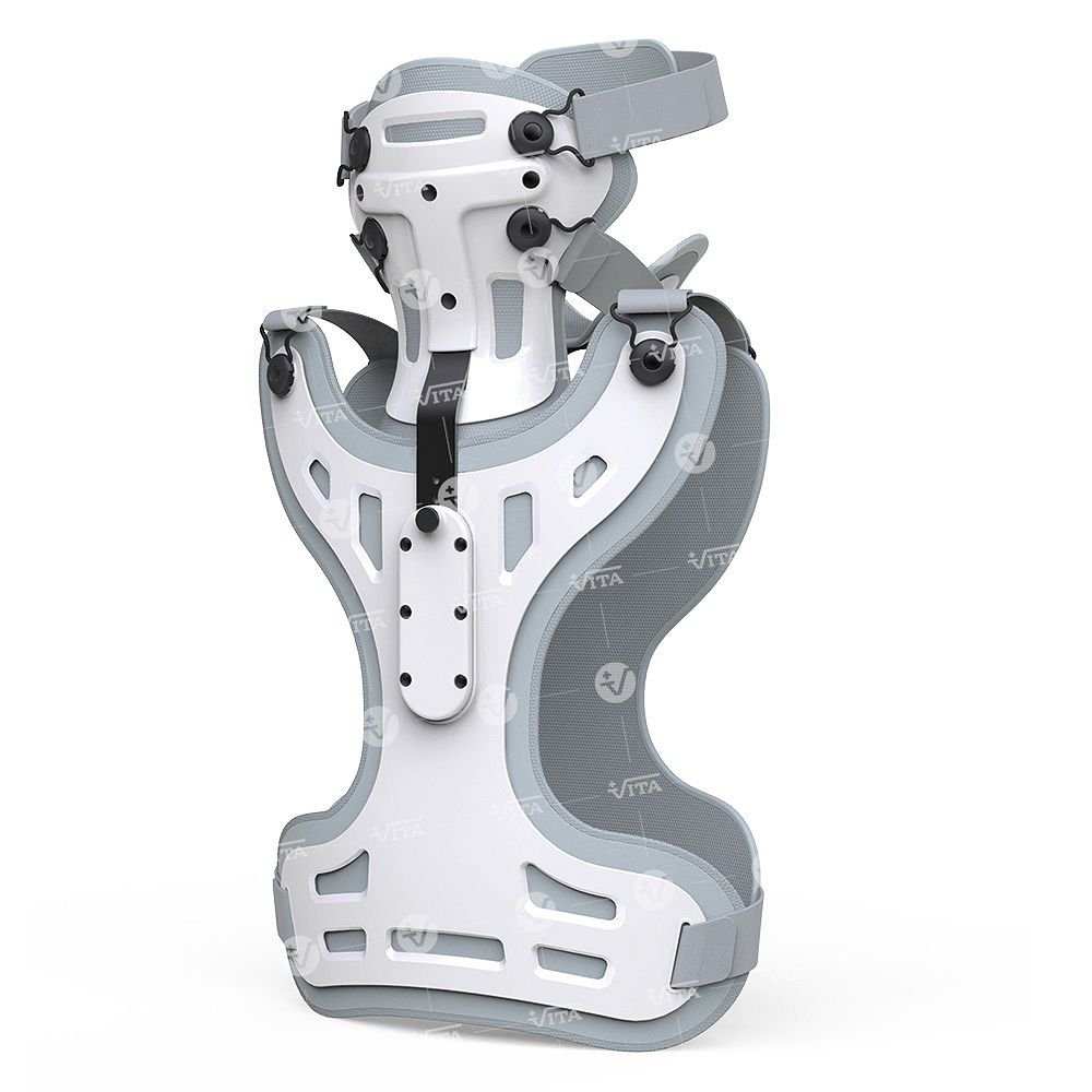 Κατασκευή από πολυαιθυλένιο, υψηλής ποιότητος και αντοχής. Εσωτερική υποαλλεργική επένδυση foam, προσθαφαιρούμενη και αυτοκόλλητη με velcro. Αεριζόμενη και αντιεφιδρωτική (πλένεται). Εφαρμόζει με αυτοκόλλητους και ρυθμιζόμενους ιμάντες με πλαστικές αγκράφες. Φέρει ενσωματωμένο μετωπιαίο ιμάντα ακινητοποίησης της κεφαλής. Το πρόσθιο σύστημα στήριξης της κάτω γνάθου, καθώς και το οπίσθιο, του ινιακού οστού, ρυθμίζονται σε θέσεις επιλογής. Το στήριγμα της κάτω γνάθου αφαιρείται εύκολα διευκολύνοντας τον ασθενή στη σίτιση.