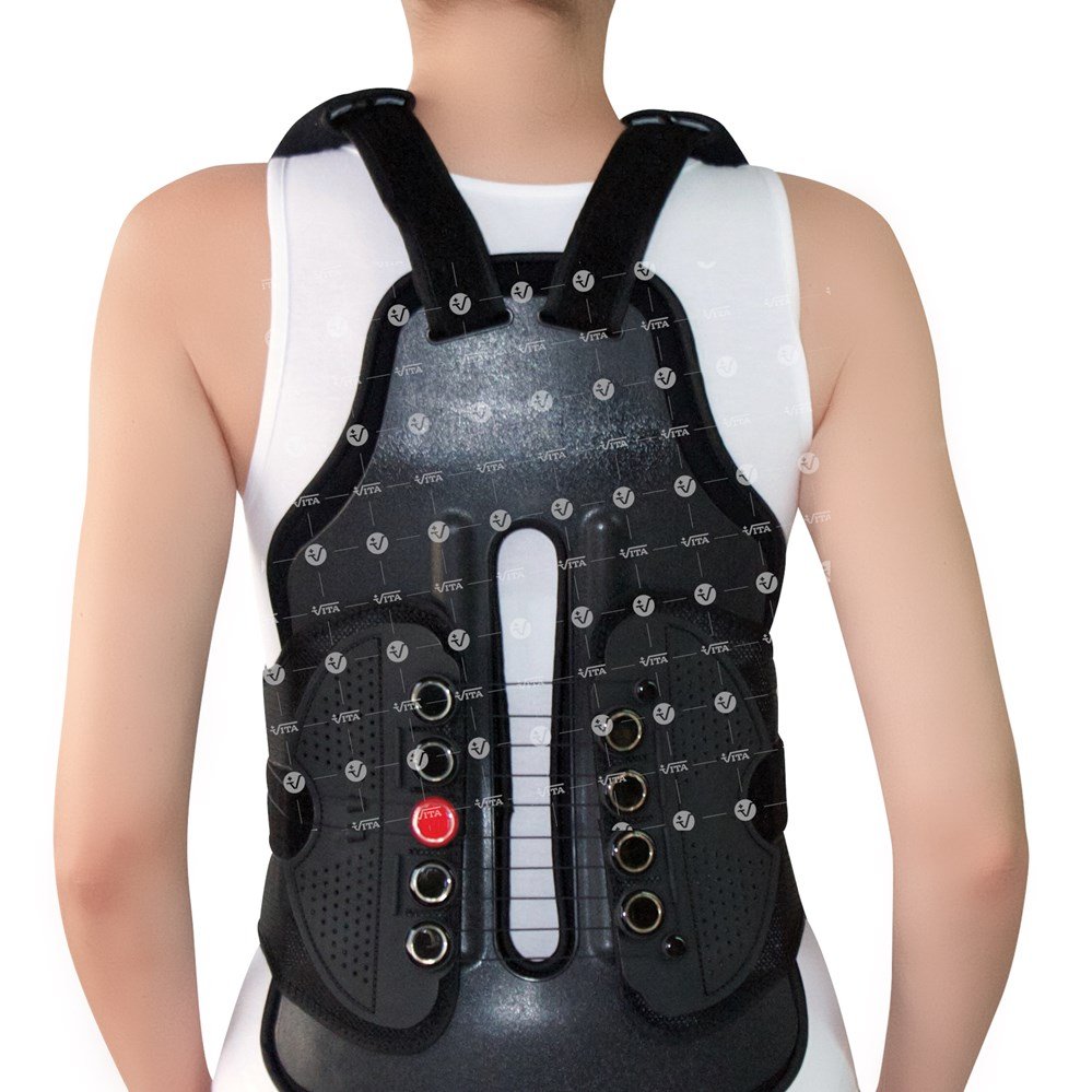 Αποτελείται από οπίσθιο θωρακοοσφυϊκό εργονομικό και ανατομικά σχεδιασμένο τμήμα. Φέρει πρόσθιο στερνικό πίεστρο ρυθμιζόμενου ύψους, για έκταση ή υπερέκταση του κορμού. Έχει εσωτερική αφρώδη, μαλακή και υποαλλεργική επένδυση. Αυτοκόλλητη ζώνη με μηχανισμό βαθμιαίας αύξησης συμπίεσης και σταθεροποίησης του κορμού. Η ζώνη είναι αυτοκόλλητη και προσθαφαιρούμενη, αναλόγως της πορείας της υγείας του ασθενή. Ρυθμιζόμενες τιράντες στήριξης της σπονδυλικής στήλης με ενσωματωμένα μαξιλαράκια ώμου. Επιδέχεται εφαρμογή αυτοκόλλητου συστήματος αεροθαλάμων για την αποφόρτιση της σπονδυλικής στήλης (Κωδικός 805008).
