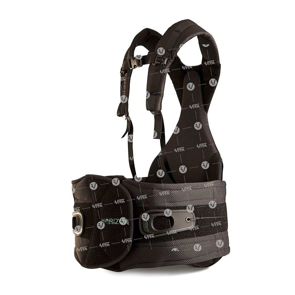 Ο θωρακοοσφυϊκός νάρθηκας Horizon TLSO 456 περιορίζει την κίνηση του κορμού και επιτυγχάνει την αποθεραπεία των θωρακοοσφυϊκών κακώσεων της σπονδυλικής στήλης. Ειδικά σχεδιασμένος για την αποκατάσταση των συμπιεστικών και συντριπτικών καταγμάτων καθώς και σε περιπτώσεις κύφωσης. Οι ιμάντες του ώμου ρυθμίζονται καθ’ ύψος τηλεσκοπικά έως 33cm. Ο οπίσθιος σχεδιασμός του νάρθηκα επιτυγχάνει εύκολη εφαρμογή, προσφέροντας μέγιστο έλεγχο της κάμψης και της στροφής της σπονδυλικής στήλης. Διαθέτει αυτοκόλητο ιμάντα (κορδόνι συμπίεσης) ο οποίος ρυθμίζει βαθμιαία και ανεξάρτητα την συμπίεση στην οσφυϊκή χώρα, ανακουφίζοντας από το μυϊκό άλγος. Η ζώνη του νάρθηκα είναι αυτοκόλητη και ρυθμιζόμενη σε μήκος. Το εμπρόσθιο τμήμα της ζώνης του νάρθηκα φέρει, εσωτερικά, πλαστικό ευκαμπτο πάνελ με «flex tabs», τα οποία κατανέμουν ισομερώς την πίεση στο σημείο εφαρμογής.