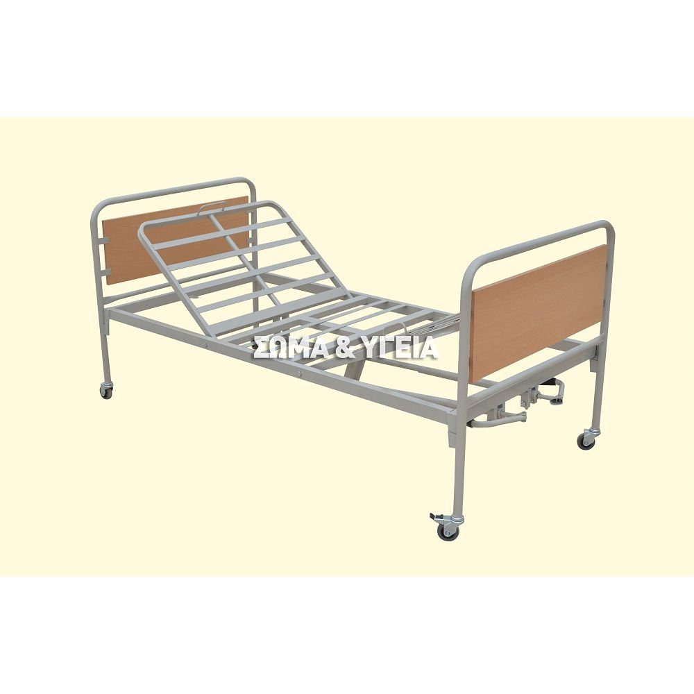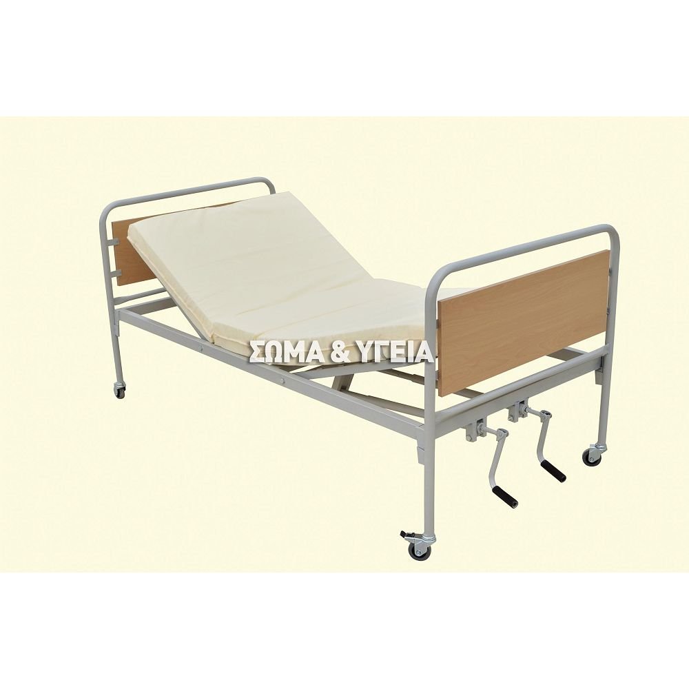 Νοσοκομειακό κρεβάτι 1.20 με δύο μανιβέλες για την ρύθμιση της κλίσης της κεφαλής και των ποδιών, πλαϊνά στηρίγματα, ρόδες ΚΑΙ στρώμα.
