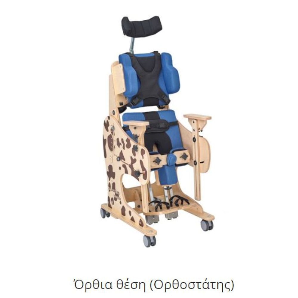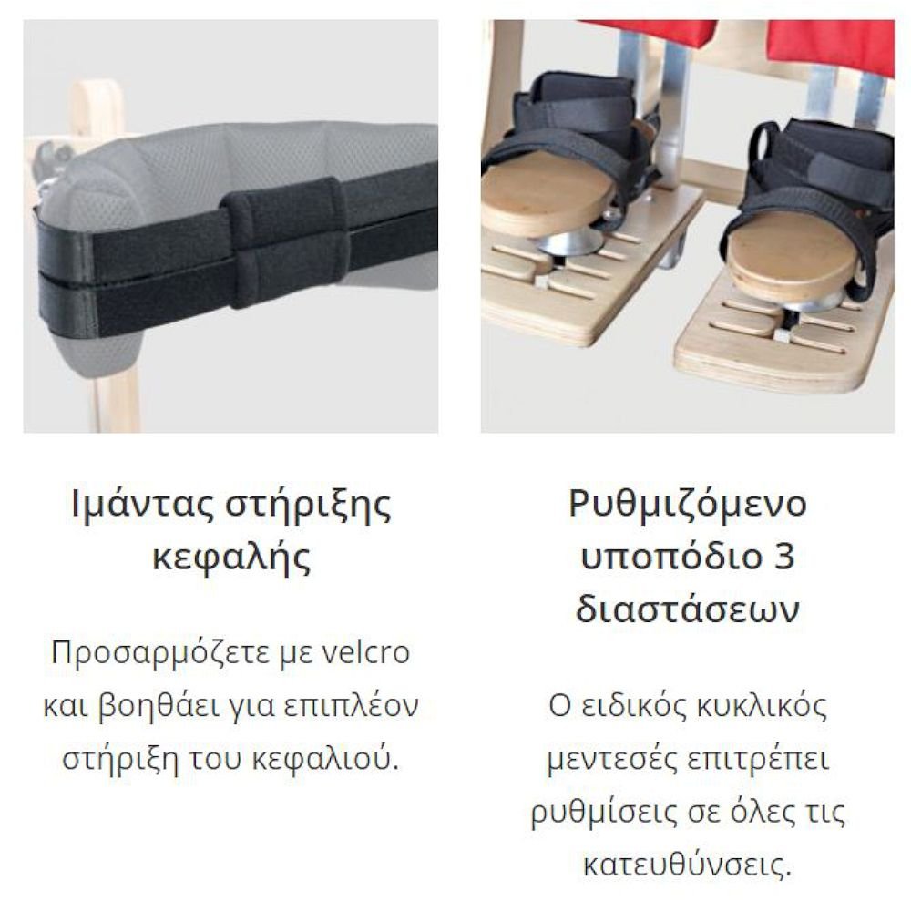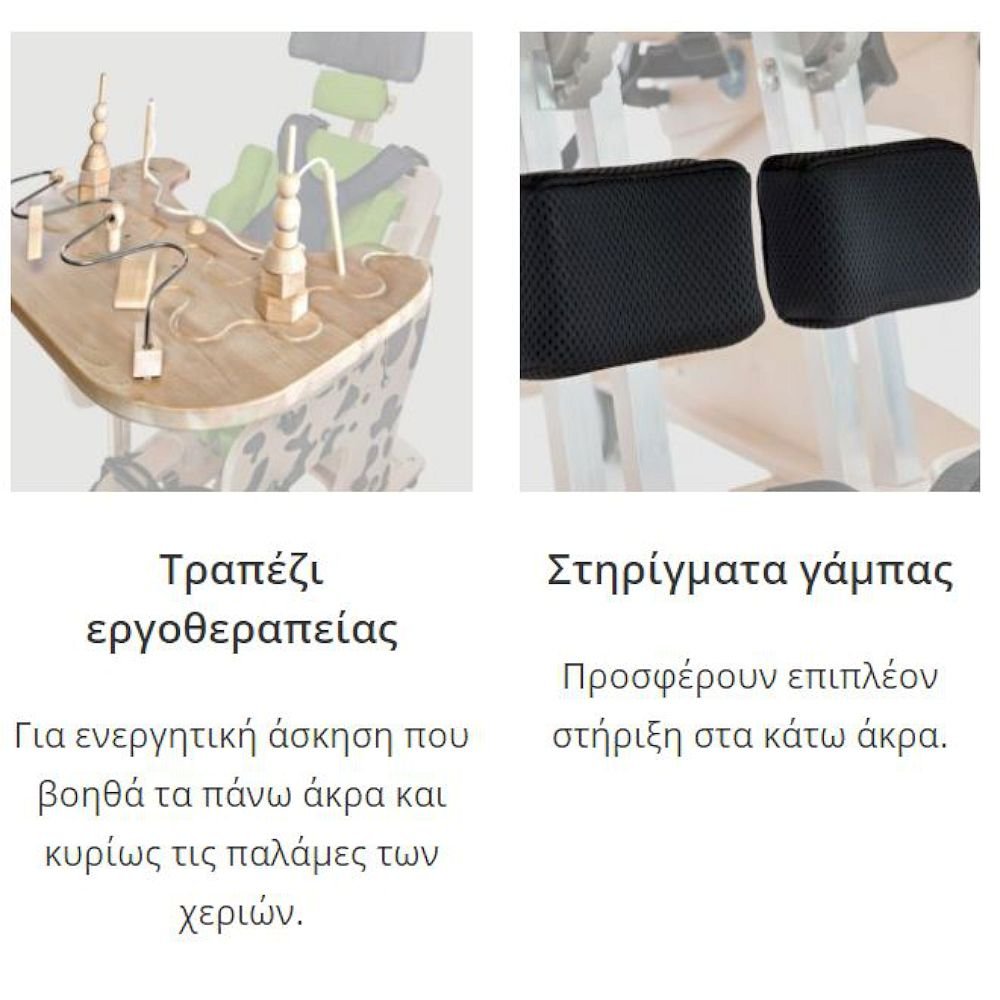Λειτουργικό και απόλυτα ασφαλές προσφέρει ορθοστάτηση χωρίς να χρειάζεται το παιδί να κατέβει από την καρέκλα καθώς είναι εξοπλισμένο με υδραυλική μπουκάλα. Επιπλέον το γιλέκο θώρακος και η ζώνη λεκάνης είναι εξοπλισμένα με το πρωτοποριακό σύστημα “hold & pull”© το οποίο μας επιτρέπει την γρήγορη και με ακρίβεια σταθεροποίηση του παιδιού